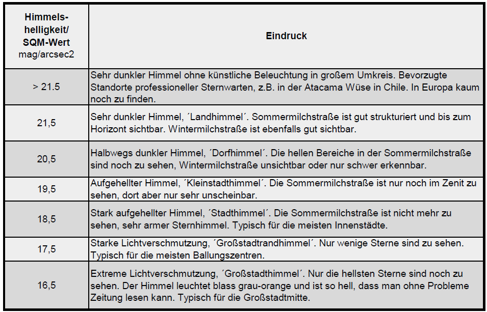 Die Himmelshelligkeit und damit der SQM-Wert wird in mag/arcsec2 angegeben. SQM-Werte kleiner 17 sind schlechte Werte, wie sie direkt in der Nähe von Straßenlaternen oder in großen Städten zu Stande kommen.