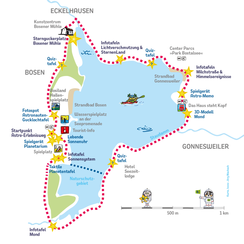 - Der Seerundweg um den Bostalsee, auf dem sich der Astro-Erlebnisweg befindet, ist Reisen für Alle zertifiziert: Link zum Bostalsee-Rundweg bei Reisen für Alle