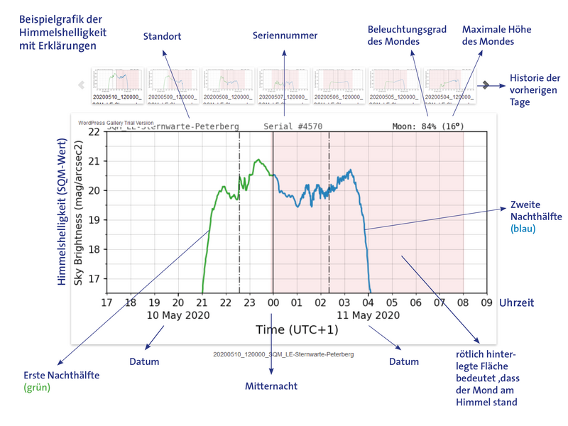 Oben links sieht man, wo die Station steht und wie sie international gefunden werden kann, also "SQM_LE-Sternwarte-Peterberg", dann folgt die Seriennummer des Gerätes, danach der maximale Beleuchtungsgrad des Mondes in Prozent (0%=Neumond, 100%=Vollmond) und die maximale Höhe des Mondes im Laufe der Nacht in Grad.