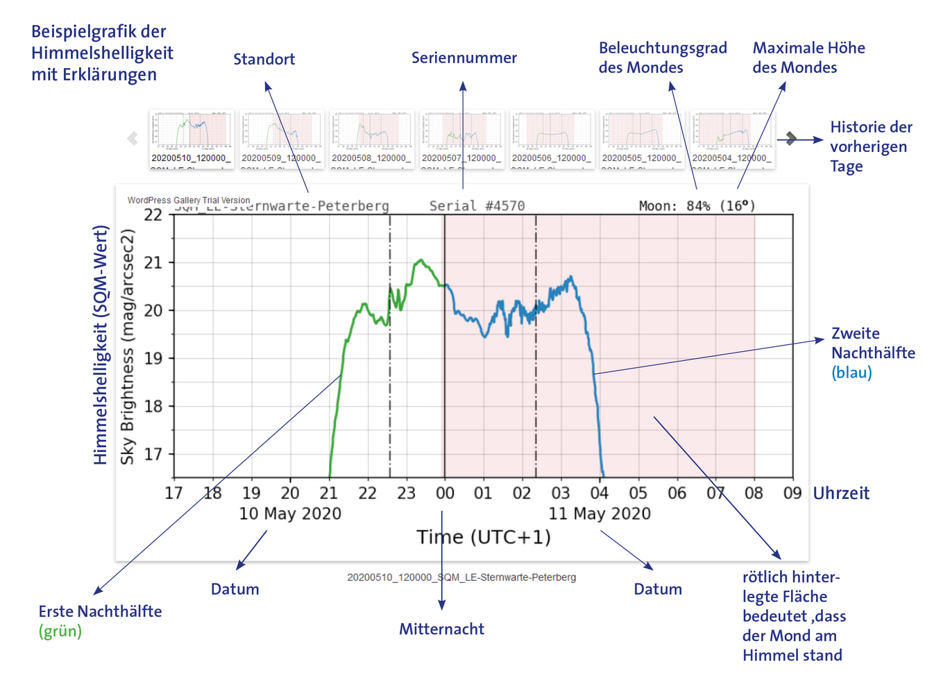 Ist die Messlinie mit einer rötlichen Fläche hinterlegt, so bedeutet das, dass der Mond am Himmel stand und daher die Werte durch Mondlicht verfälscht sind (weil dieser recht hell leuchten kann).